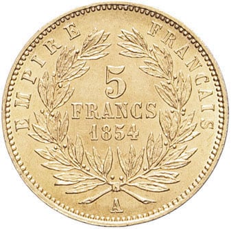 - Second Empire / Napoléon III (1852-1870). 5 francs tête nue petit module, tranche lisse 1854, A, Paris.