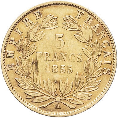 - Second Empire / Napoléon III (1852-1870). 5 francs tête nue, grand module 1855, A, Paris.
