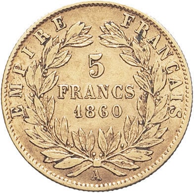 Rv. EMPIRE FRANÇAIS. Dans une couronne formée de deux branches : 5 FRANCS (date) et au-dessous (atelier).