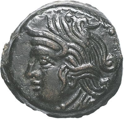 Av. Tête féminine (?) à gauche, la chevelure en longues et fines mèches, le cou orné d'un torque.