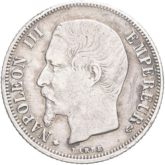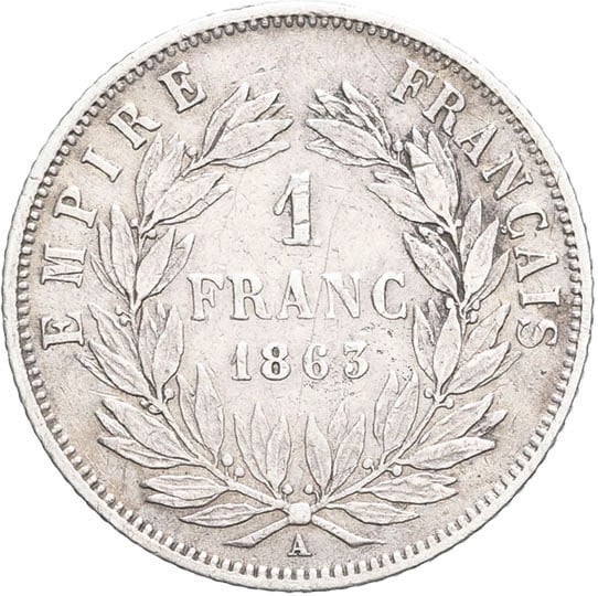 - Second Empire / Napoléon III (1852-1870). 1 franc tête nue 1863, A, Paris.