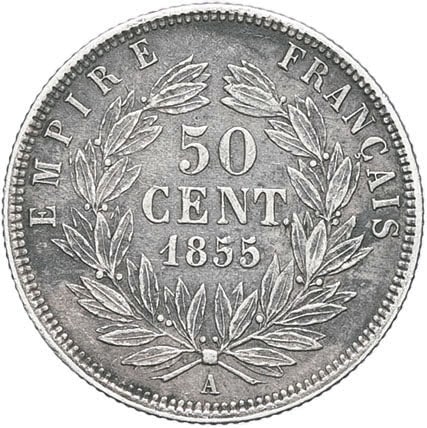 - Second Empire / Napoléon III (1852-1870). 50 centimes tête nue 1855, A, Paris.