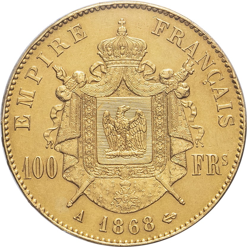 Rv. EMPIRE FRANÇAIS. Armes impériales posées sur un manteau couronné et brochant sur le sceptre et la main de justice, accostées de 100 - FRs ; au-dessous (atelier) (date) (différent).