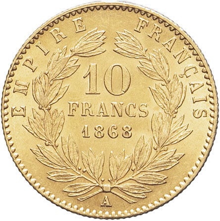 Rv. EMPIRE FRANÇAIS. Dans une couronne formée de deux branches : 10 FRANCS (date) et au-dessous (atelier).
