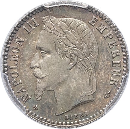 Av. (différent) NAPOLEON III - EMPEREUR (différent). Tête laurée à gauche ; au-dessous signature BARRE.