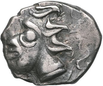 Av. Tête de type négroïde à gauche, la chevelure en un rang d’esses couchées sur un rang de mèches en V.