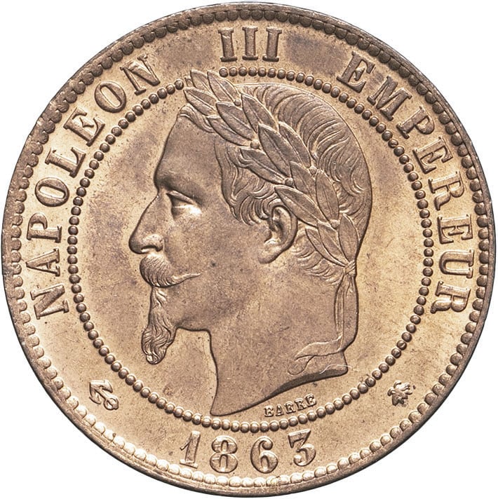 - Second Empire / Napoléon III (1852-1870). Dix centimes tête laurée 1863, A, Paris.