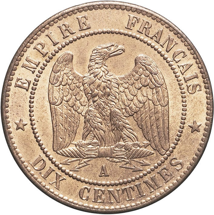 Rv. EMPIRE FRANÇAIS / * DIX CENTIMES *. Aigle éployée, la tête à droite, sur un foudre ; au-dessous (atelier).