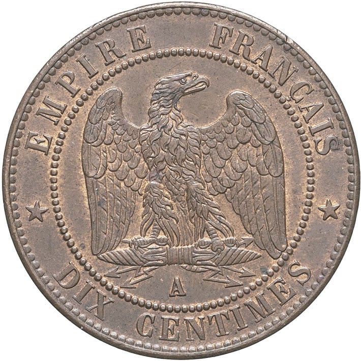 Rv. EMPIRE FRANÇAIS / * DIX CENTIMES *. Aigle éployée, la tête à droite, sur un foudre ; au-dessous (atelier).
