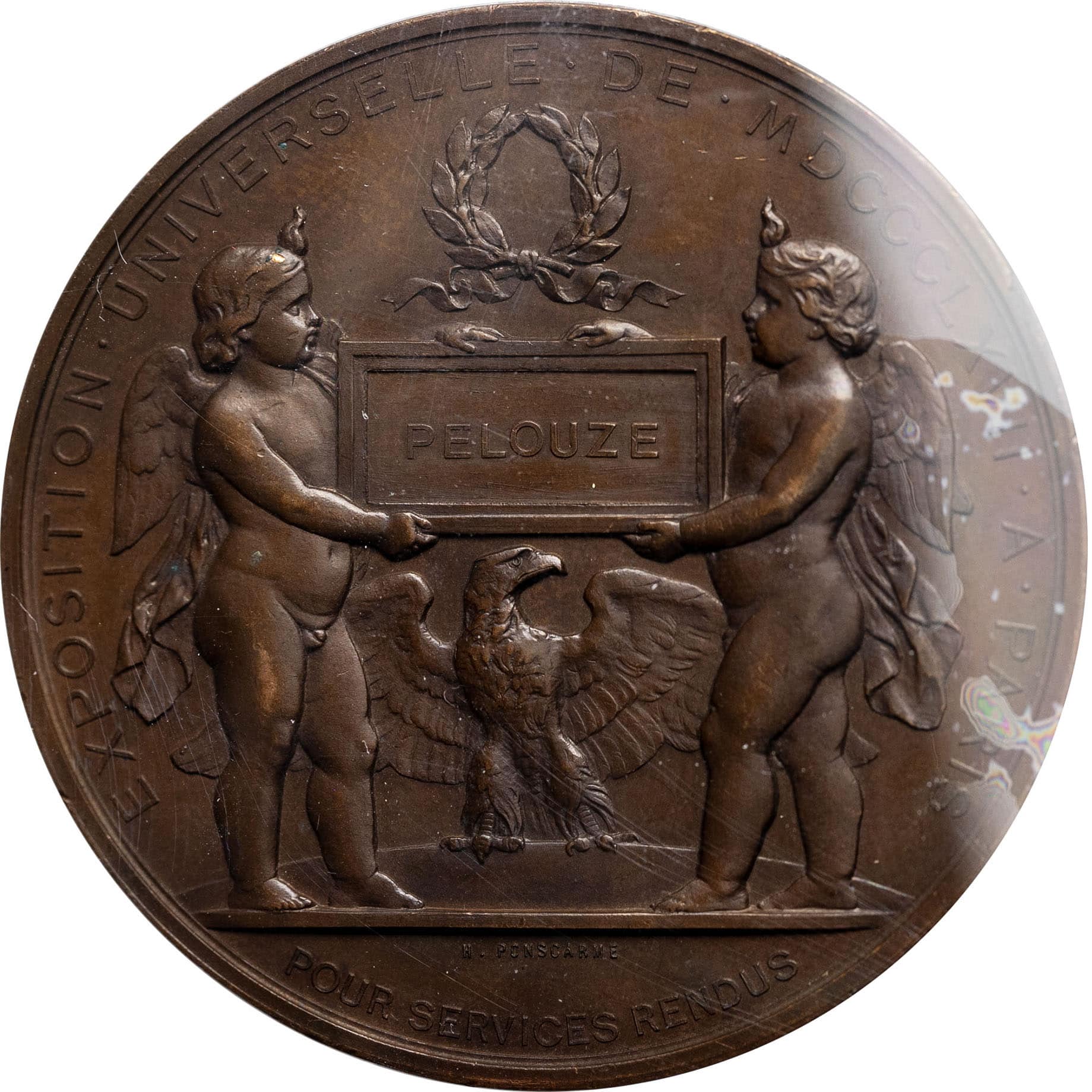 Rv. EXPOSITION. UNIVERSELLE. DE. MDCCCLXVII. A. PARIS / POUR SERVICES RENDUS. Deux angelots tenant un cartouche surmonté d’une couronne ; derrière, un aigle aux ailes éployées ; signature H. PONSCARME. F.