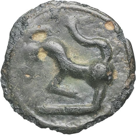 Rv. Cheval à gauche, la queue au-dessus du dos ; le métatarse démesuré forme une ligne d'exergue.