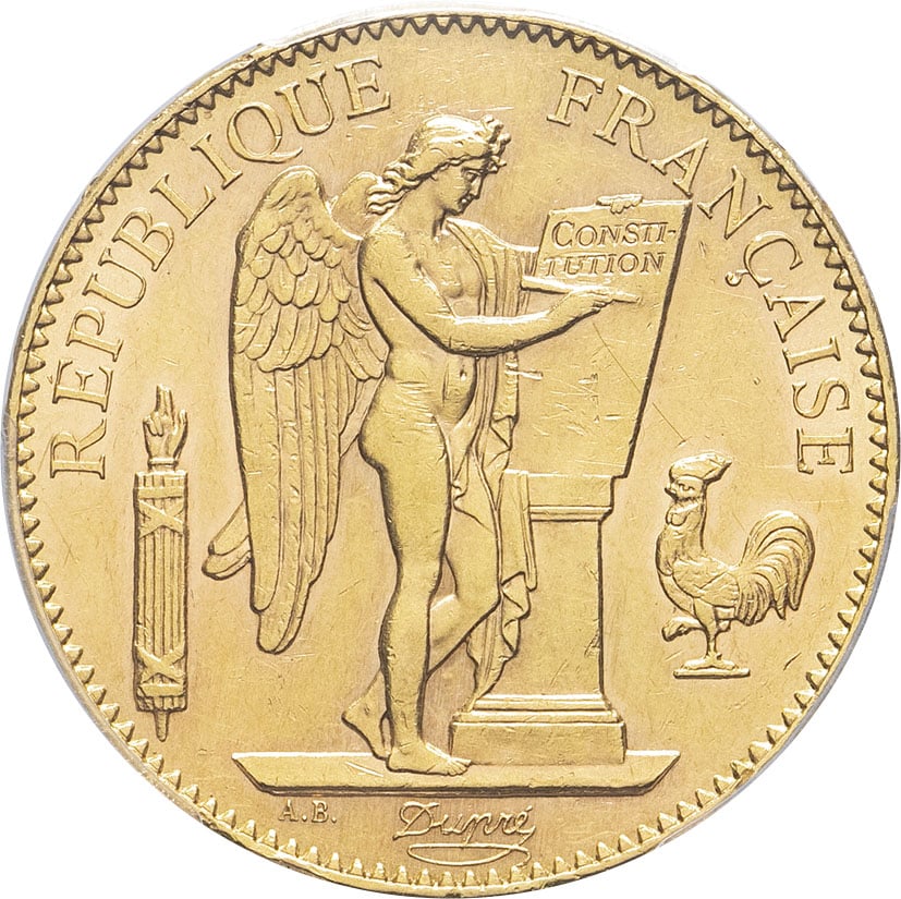 Av. RÉPUBLIQUE FRANÇAISE. Génie ailé de la République debout à droite, gravant le mot CONSTITUTION sur une table, accosté d’un faisceau à gauche et d’un coq à droite ; à l’exergue : signatures A.B. et Dupré.