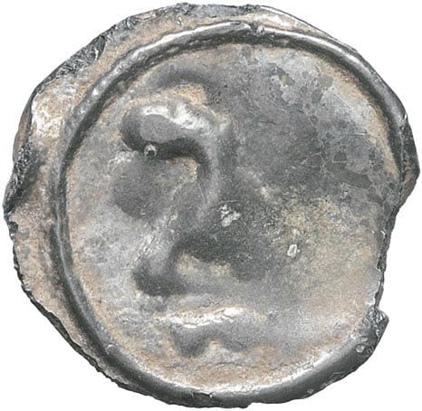 Rv. Cheval à gauche, la queue au-dessus du dos ; les jambes démesurées se rejoignent en formant une double ligne d'exergue.
