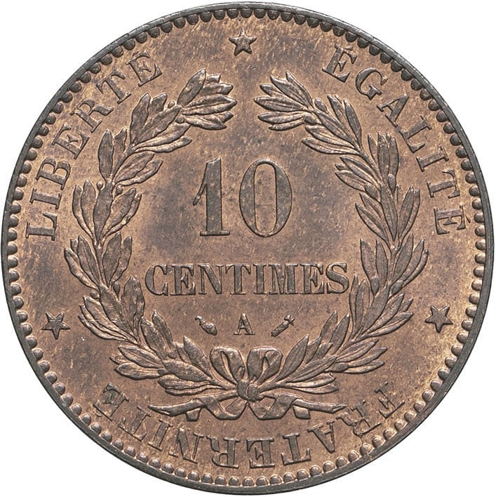 Rv. LIBERTÉ. ÉGALITÉ. FRATERNITÉ. Dans une couronne formée de deux branches, sous une étoile : 10 CENTIMES (différent) (atelier) (différent).