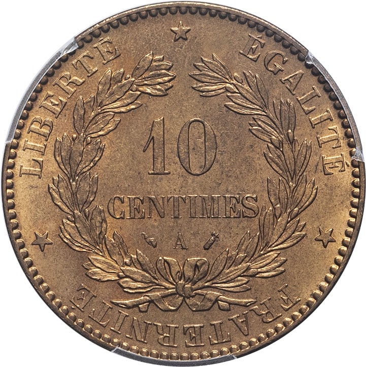 Rv. LIBERTÉ. ÉGALITÉ. FRATERNITÉ. Dans une couronne formée de deux branches, sous une étoile : 10 CENTIMES (différent) (atelier) (différent).