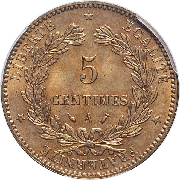 Rv. LIBERTE. EGALITE. FRATERNITE. Dans une couronne formée de deux branches, sous une étoile : 5 CENTIMES (différent) (atelier) (différent).