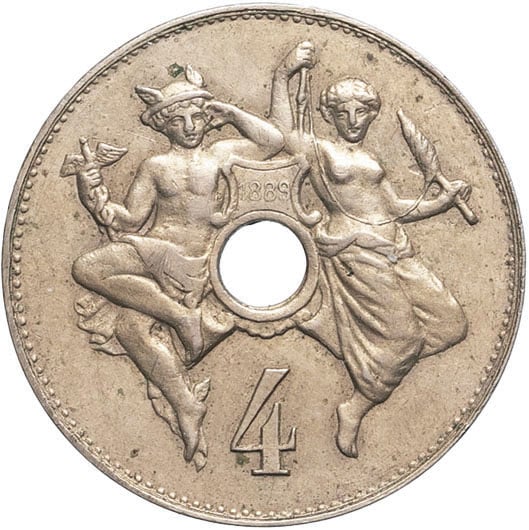 Rv. Autour du trou central rond, Mercure représentant le Commerce et allégorie représentant l’Industrie, au-dessous 4 et entre eux un cartouche avec la (date).