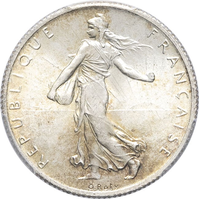 Av. REPUBLIQUE FRANÇAISE. La Semeuse à gauche, avec le soleil levant, marchant et semant à contre-vent ; signature O. ROTY.