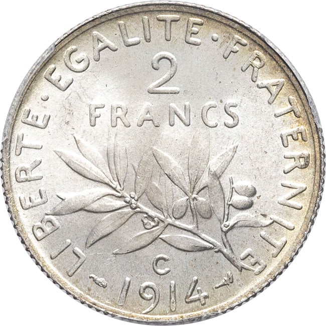 - IIIe République (1870-1940). 2 francs Semeuse 1914, C, Castelsarrasin.