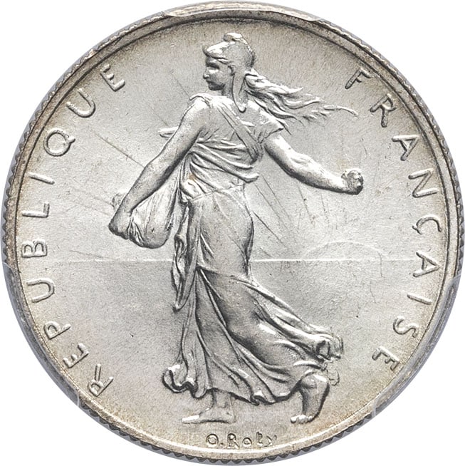 Av. REPUBLIQUE FRANÇAISE. La Semeuse à gauche, avec le soleil levant, marchant et semant à contre-vent ; signature O. ROTY.