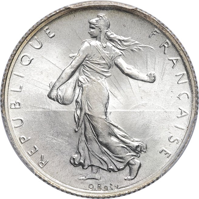 Av. REPUBLIQUE FRANÇAISE. La Semeuse à gauche, avec le soleil levant, marchant et semant à contre-vent ; signature O. ROTY.