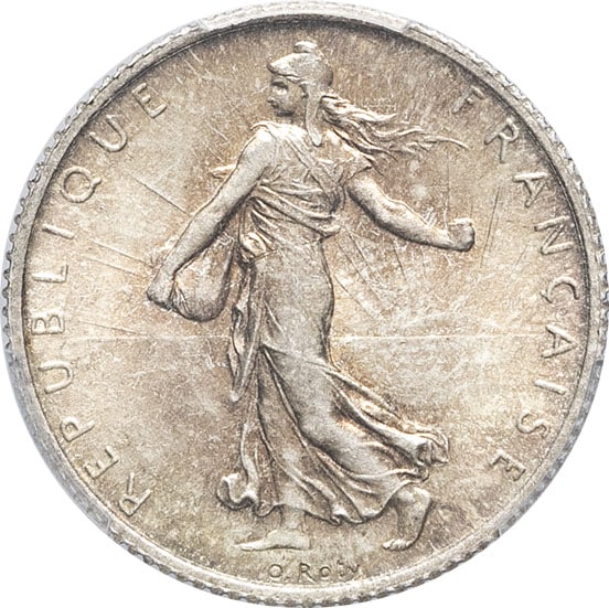 Av. REPUBLIQUE FRANÇAISE. La Semeuse à gauche, avec le soleil levant, marchant et semant à contre-vent ; signature O. ROTY.