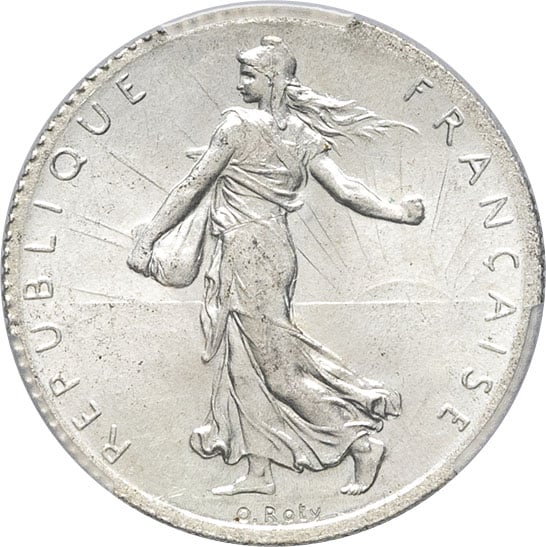 Av. REPUBLIQUE FRANÇAISE. La Semeuse à gauche, avec le soleil levant, marchant et semant à contre-vent ; signature O. ROTY.