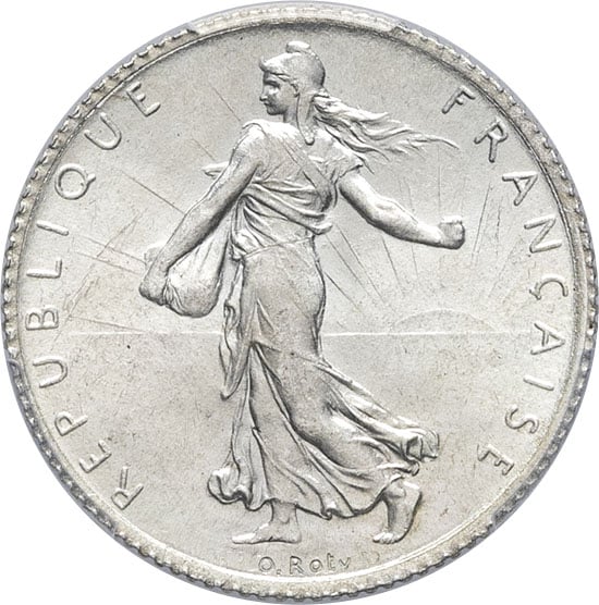 Av. REPUBLIQUE FRANÇAISE. La Semeuse à gauche, avec le soleil levant, marchant et semant à contre-vent ; signature O. ROTY.