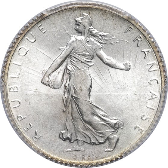 Av. REPUBLIQUE FRANÇAISE. La Semeuse à gauche, avec le soleil levant, marchant et semant à contre-vent ; signature O. ROTY.