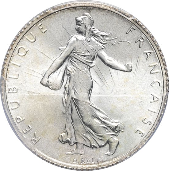 Av. REPUBLIQUE FRANÇAISE. La Semeuse à gauche, avec le soleil levant, marchant et semant à contre-vent ; signature O. ROTY.