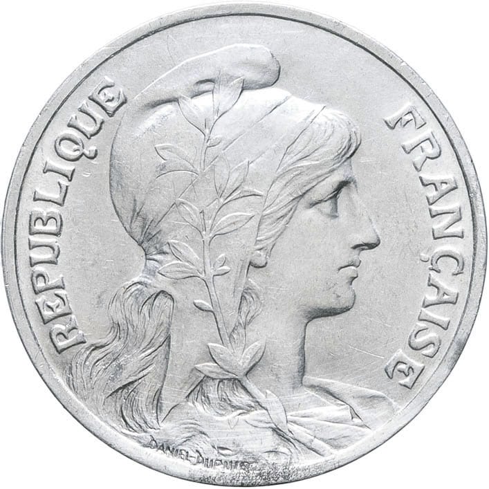 - IIIe République (1870-1940). Essai de 10 centimes Daniel-Dupuis en aluminium 1908, Paris.
