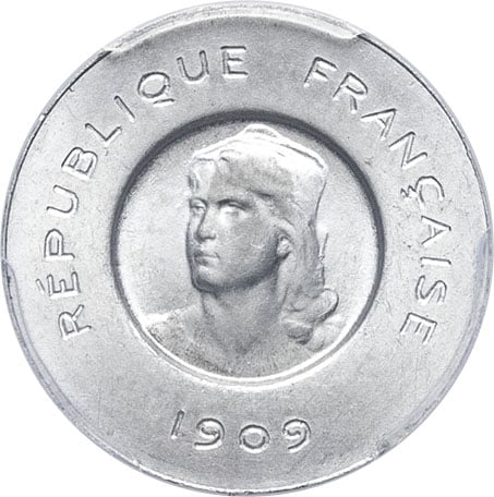 - IIIe République (1870-1940). Essai de 5 centimes François Rude, petit module, en aluminium 1909, Paris.