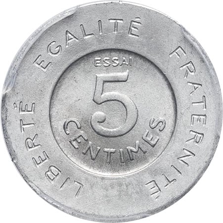 Rv. LIBERTÉ ÉGALITÉ FRATERNITÉ. Dans une cuvette circulaire : 5 CENTIMES et au-dessus ESSAI.