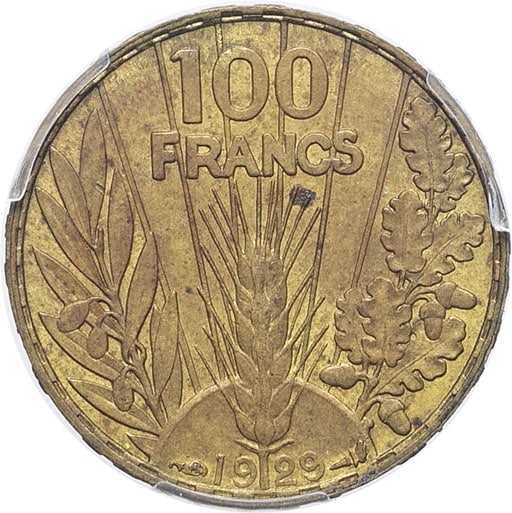 Rv. 100 FRANCS. Épi entre une branche d’olivier et une branche de chêne ; à l’exergue (différents) et (date).