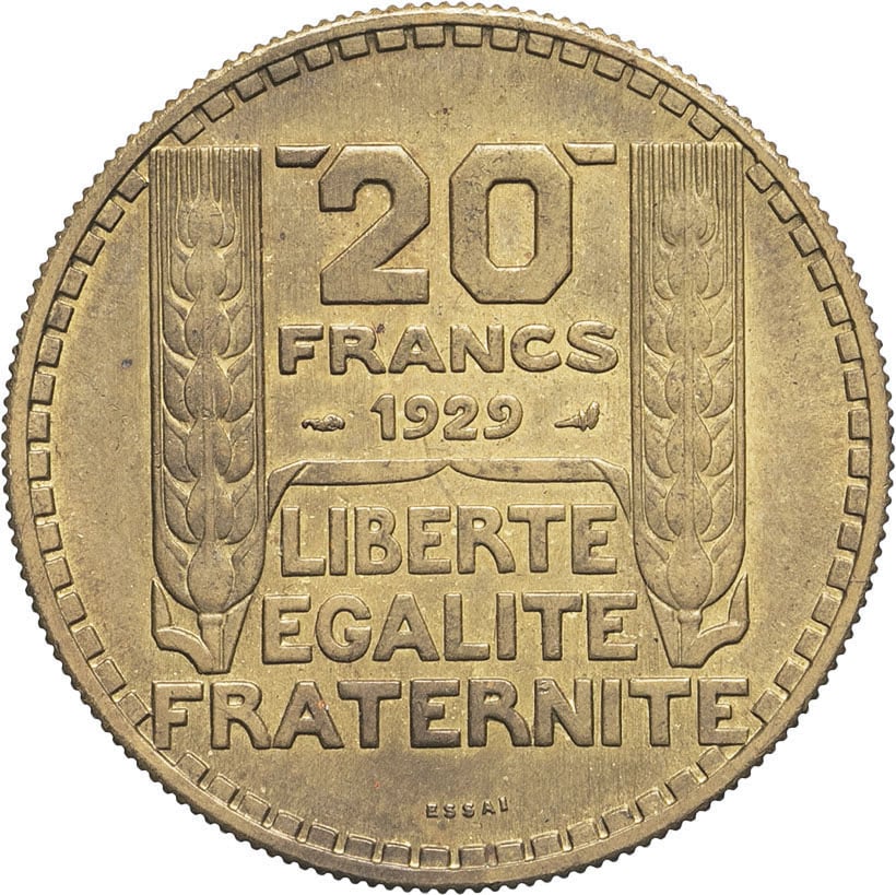 - IIIe République (1870-1940). Essai de 20 francs Turin en cupro-aluminium 1929, Paris.