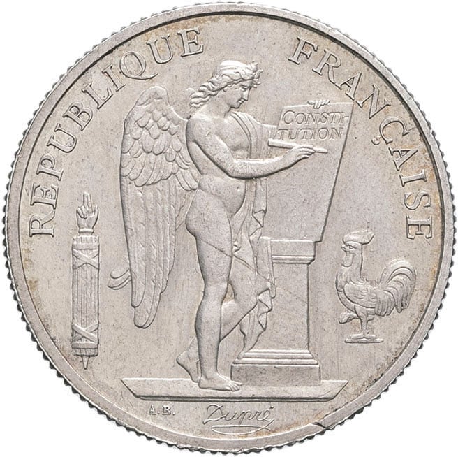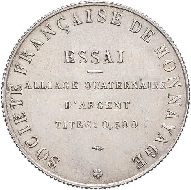 - IIIe République (1870-1940). Essai quaternaire d’alliage, type Génie, de la Société Française de Monnayage ND, Paris.