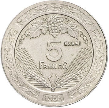 - IIIe République (1870-1940). Essai de 5 francs, petit module, concours de Vézien 1933, Paris.
