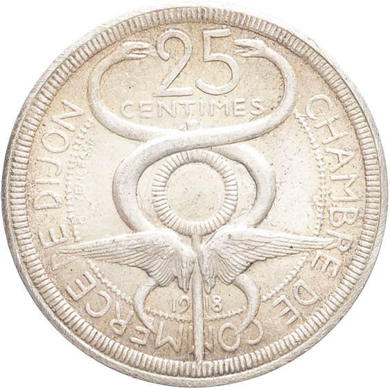 - IIIe République (1870-1940). Épreuve en argent de 25 centimes, Chambre de commerce de Dijon, par Ovide Yencesse 1918, Paris (Paul Leclère).