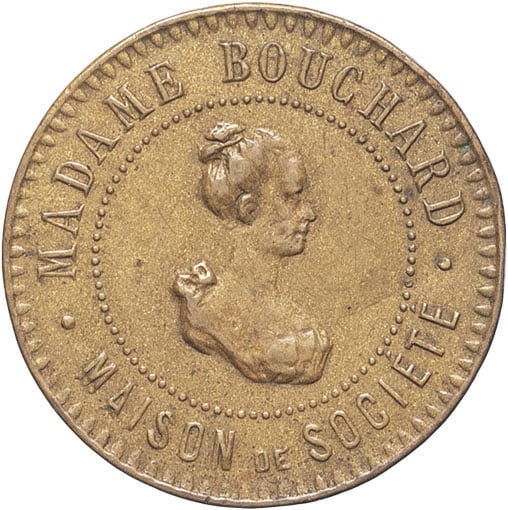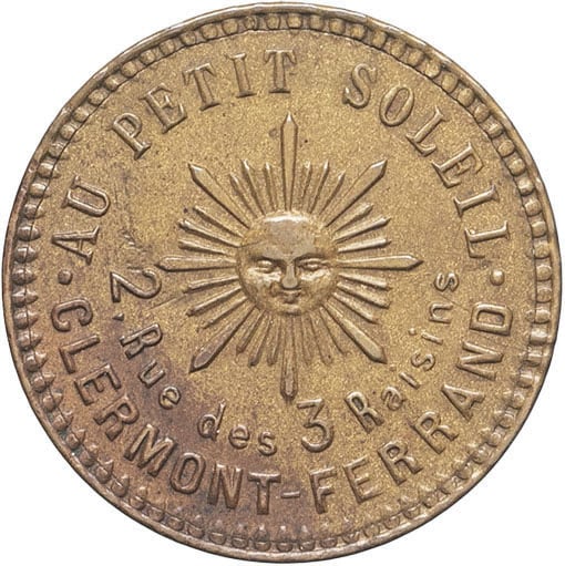 - IIIe République (1870-1940). Jeton de tolérance, maison de société “Au petit soleil”, madame Bouchard à Clermont-Ferrand ND.