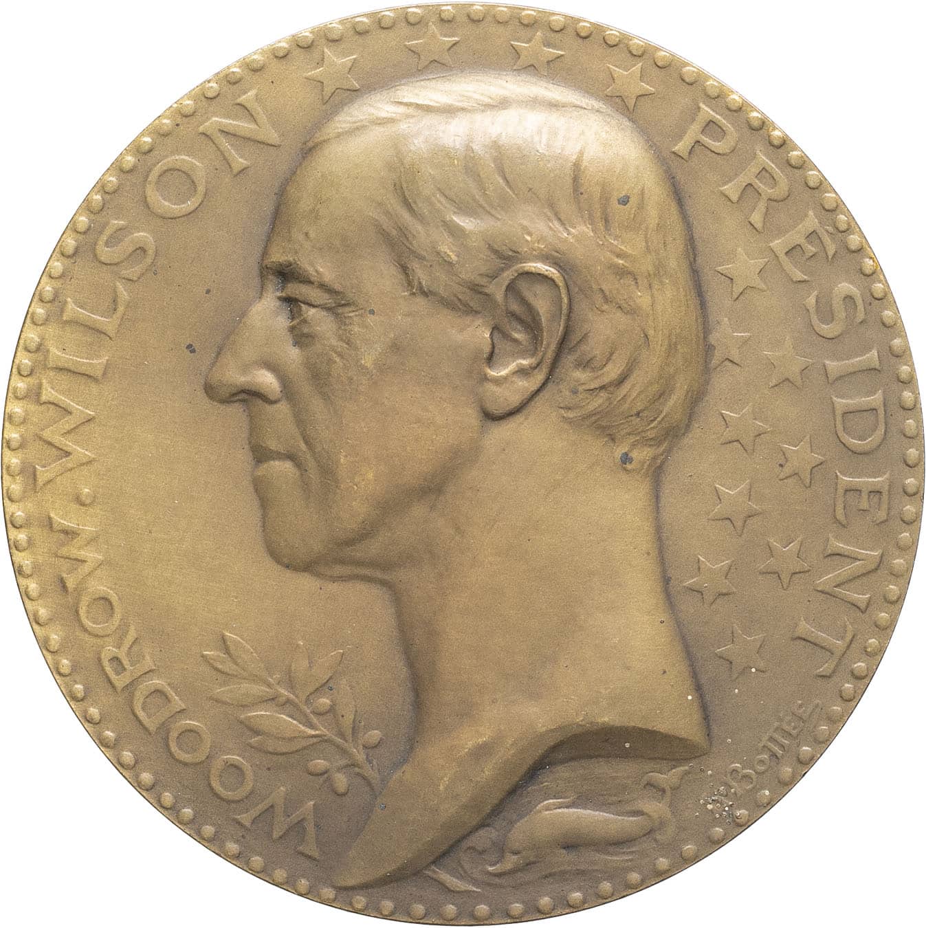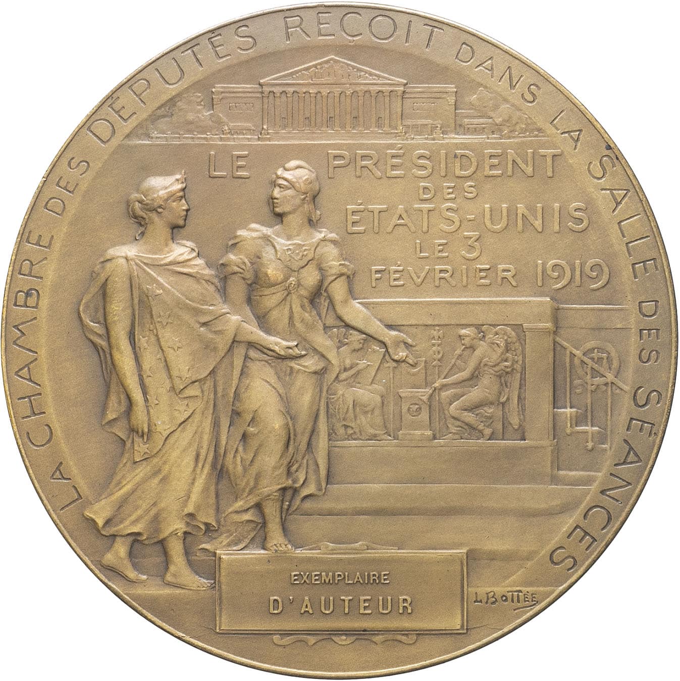 - IIIe République (1870-1940). Médaille, la Chambre des députés reçoit le président des États-Unis Woodrow Wilson, par L. Bottée, exemplaire d’auteur 1919, Paris.