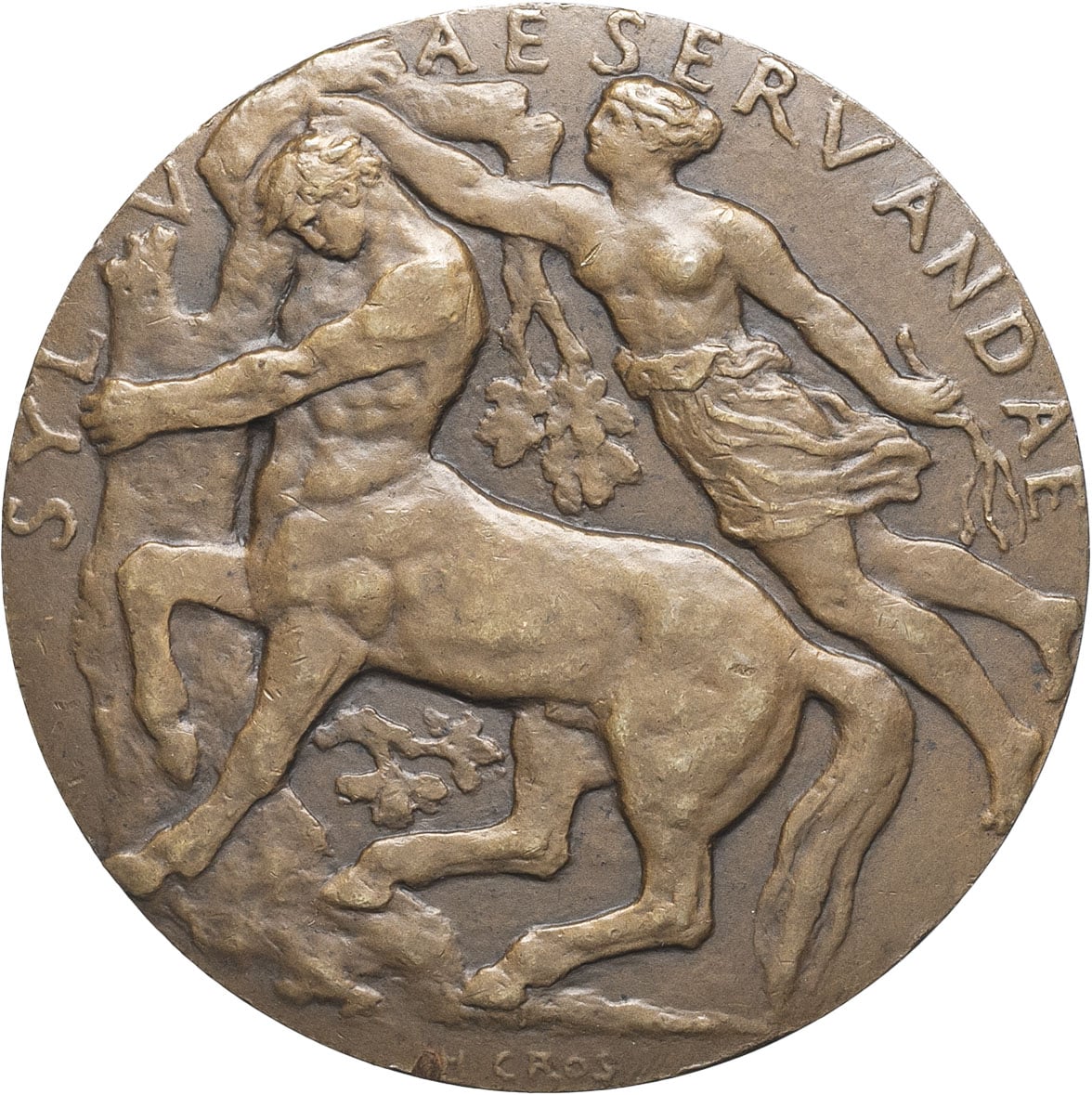 Rv. SYLVAE SERVANDAE (Protection des forêts). Un centaure à gauche en train d’arracher un arbre, tandis qu’une dryade (nymphe des arbres) lui tire les cheveux pour le punir ; signature H. CROS.