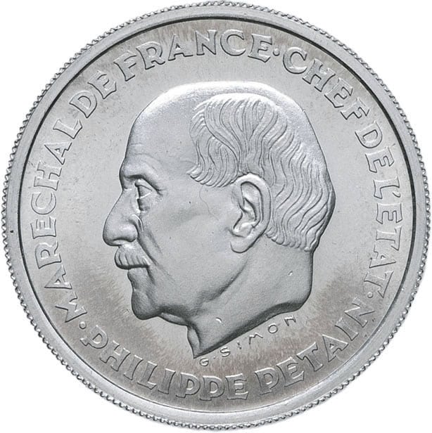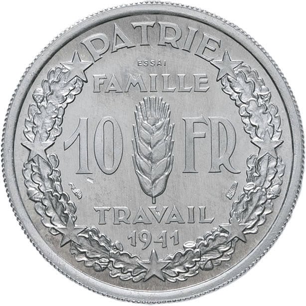 - État Français (1940-1944). Essai de 10 francs Pétain en aluminium par Simon 1941, Paris.
