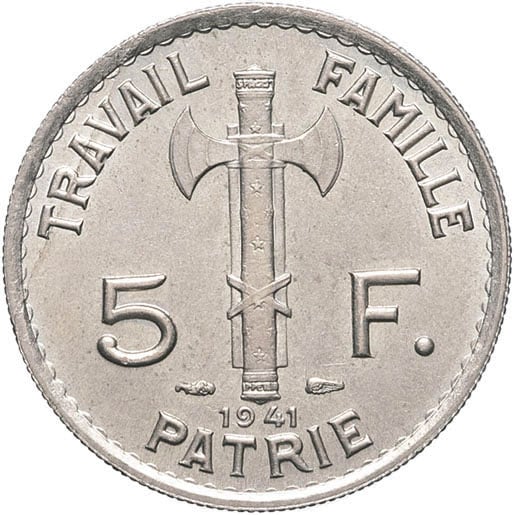 - État Français (1940-1944). 5 francs Pétain 1941, Paris.