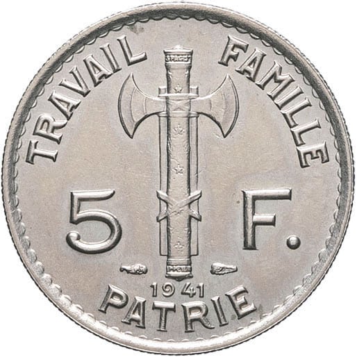 - État Français (1940-1944). 5 francs Pétain 1941, Paris.