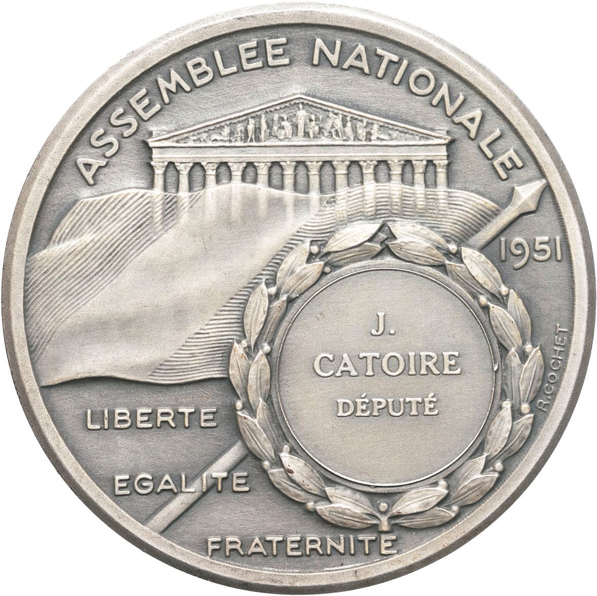 - IVe République (1947-1958). Médaille d’identité de l’Assemblée nationale par L. Bazor et R. Cochet 1951, Paris.