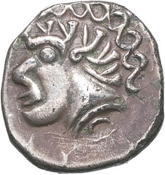 Av. Tête à gauche, à la chevelure en mèches droites parallèles, surmontée de mèches en S.