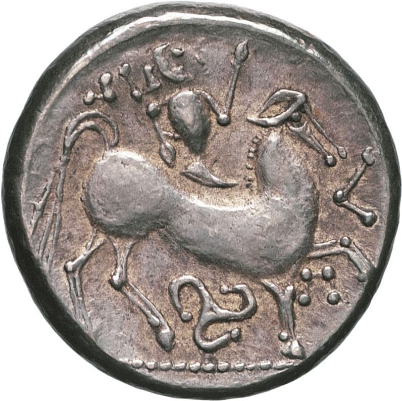 Rv. Π-Λ-Λ-Π. Cheval à droite surmonté d’un cavalier stylisé aux bras comme une marionnette ; triskèle au-dessous.