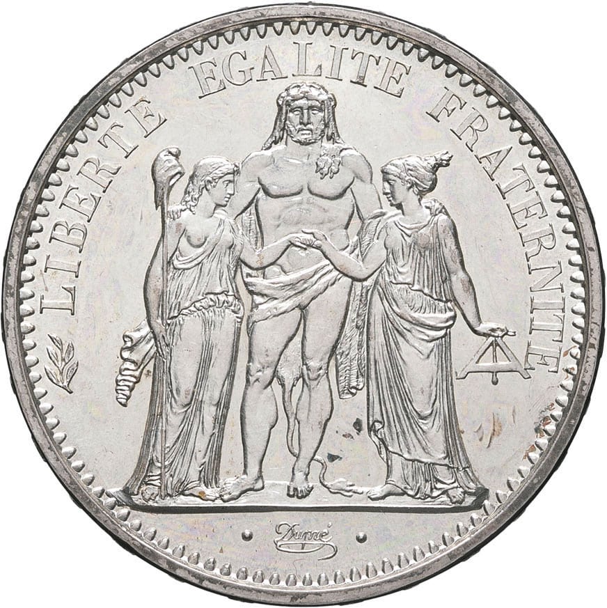 Av. LIBERTÉ ÉGALITÉ FRATERNITÉ. Hercule debout de face avec la léonté, unissant la Liberté debout à gauche tenant une pique surmontée d’un bonnet phrygien, et l’Égalité debout à droite, tenant le niveau. À l’exergue signature cursive Dupré.