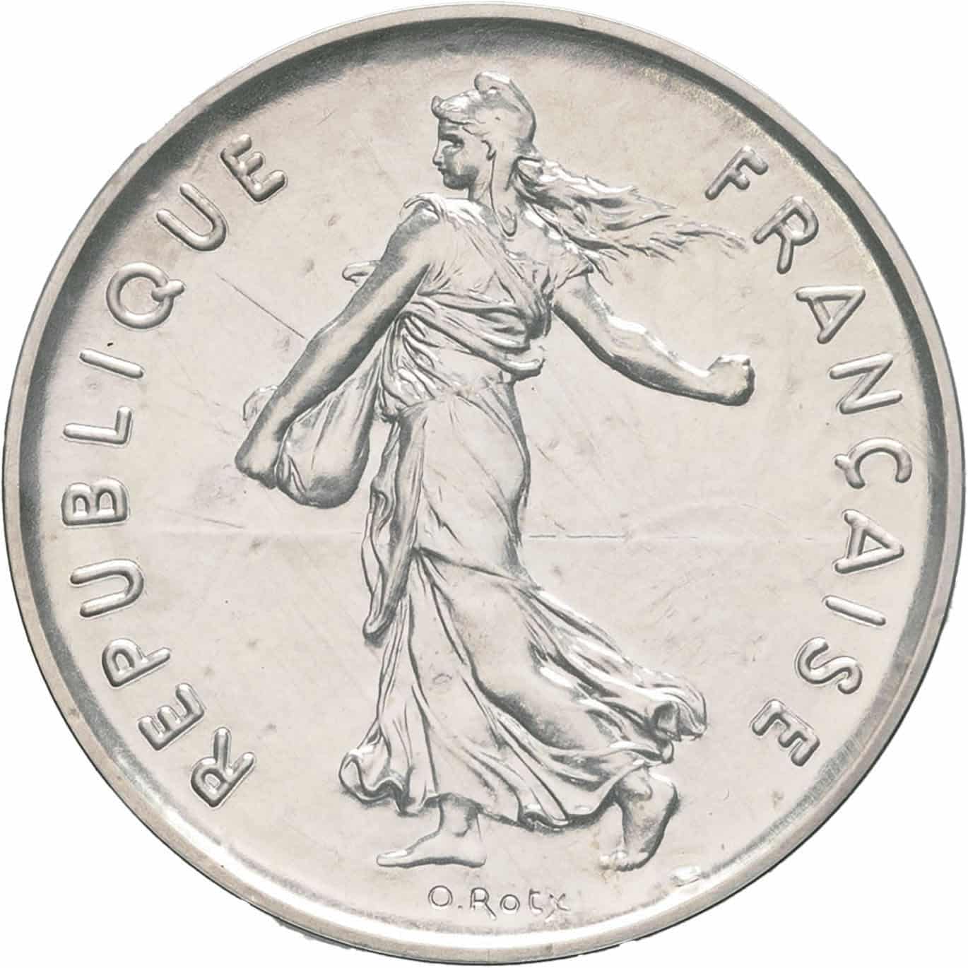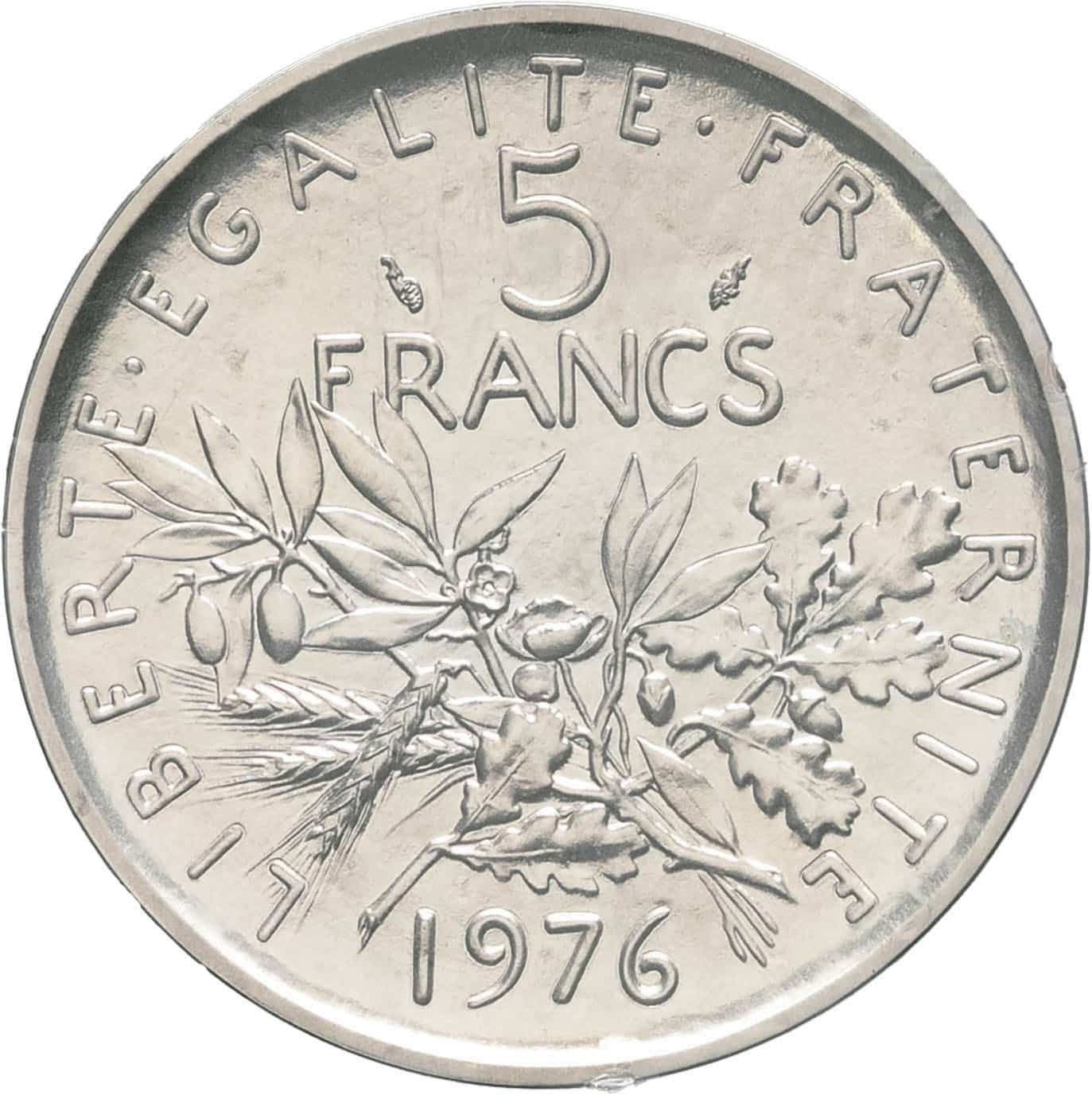 - Ve République (1958 à nos jours). Piéfort de 5 francs Semeuse en argent 1976, Pessac.