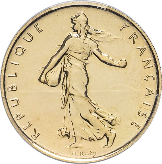 - Ve République (1958 à nos jours). 1 franc Semeuse en Or, épreuve BU 2001, Pessac.